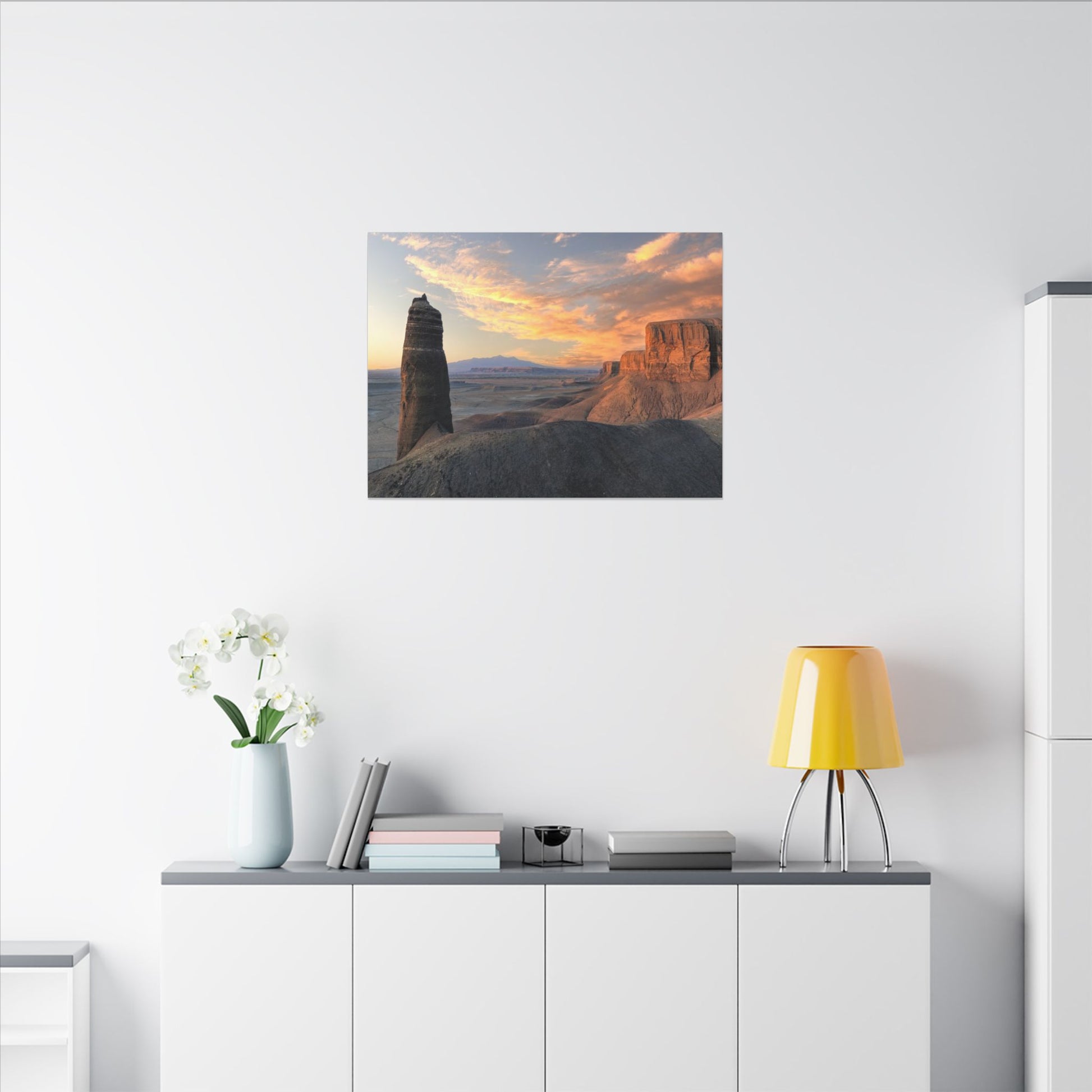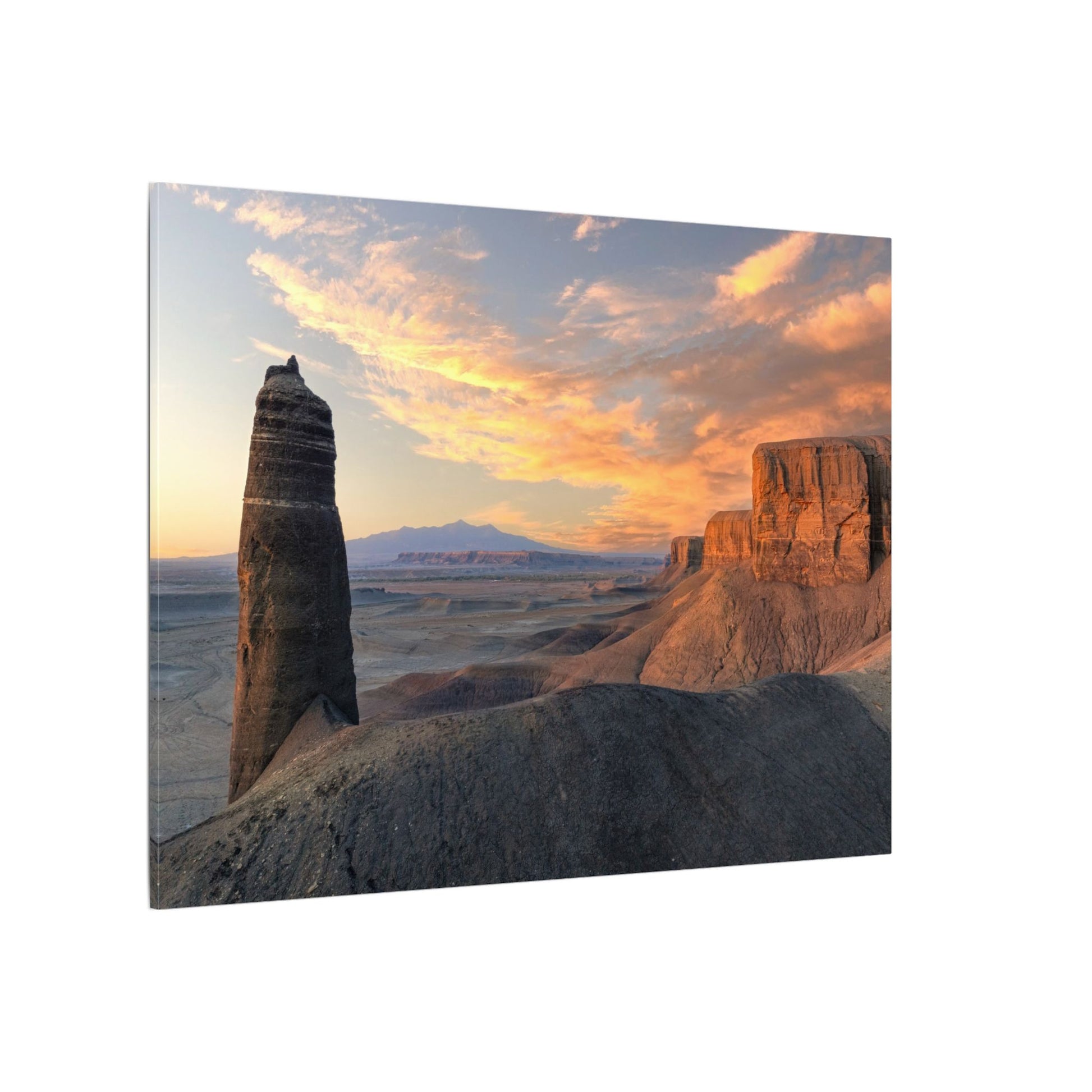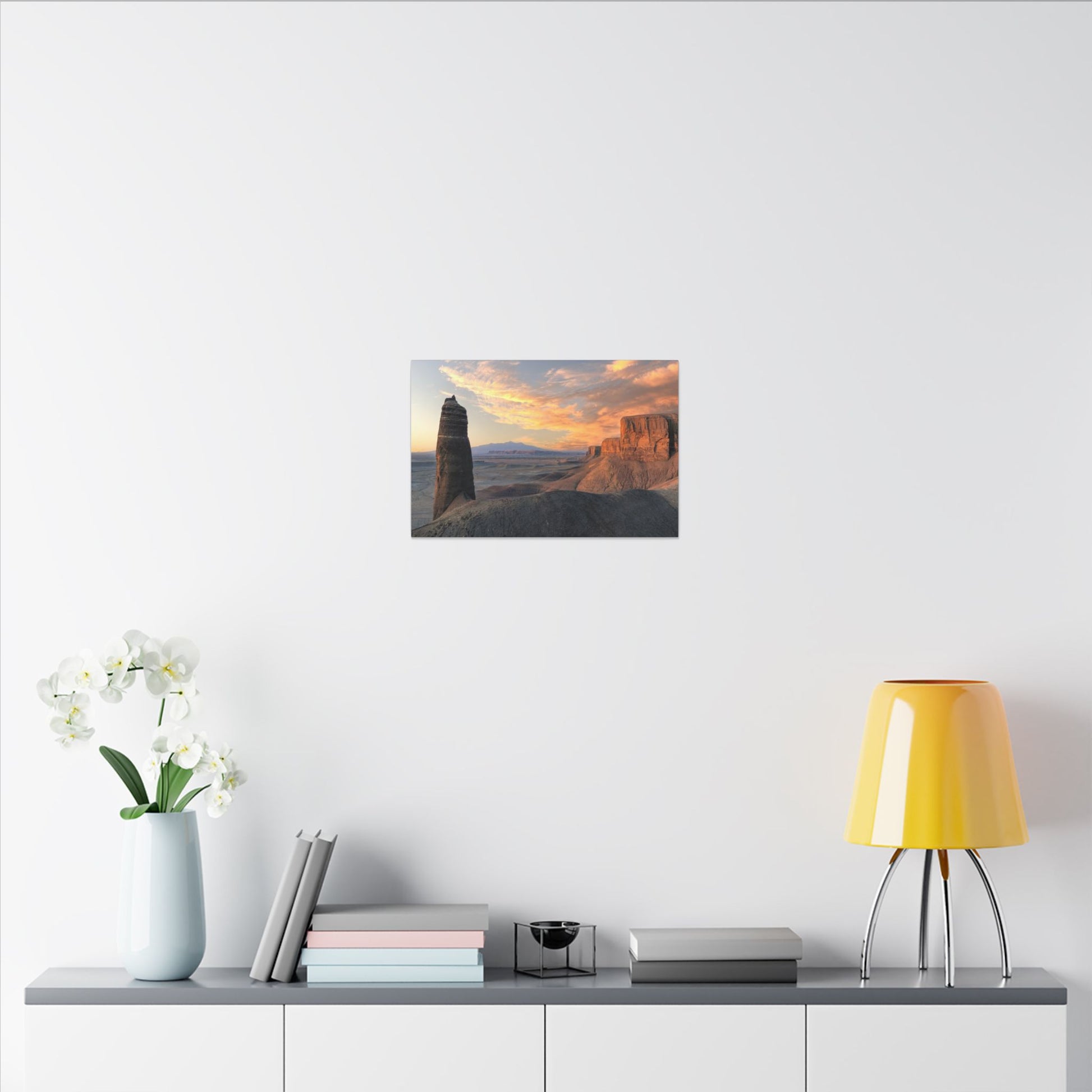 A matte stretched canvas that brings Angel Of Death, Utah, a wide-open desert light into your home. This gallery-style print captures warm sunrise hues and sculpted rock formations on a durable cotton-poly canvas with a subtle matte finish. Colors stay vivid thanks to a special coating and UL-certified Greenguard Gold latex inks, while a simple pine profile frame keeps the image clean and float-mounted from the wall. Soft rubber pads on the back protect surfaces and hold the piece steady. It’s a quiet, contemplative artwork made to sit above a sofa, in an entryway, or in a study — a reminder of wide horizons and slow, golden mornings.
