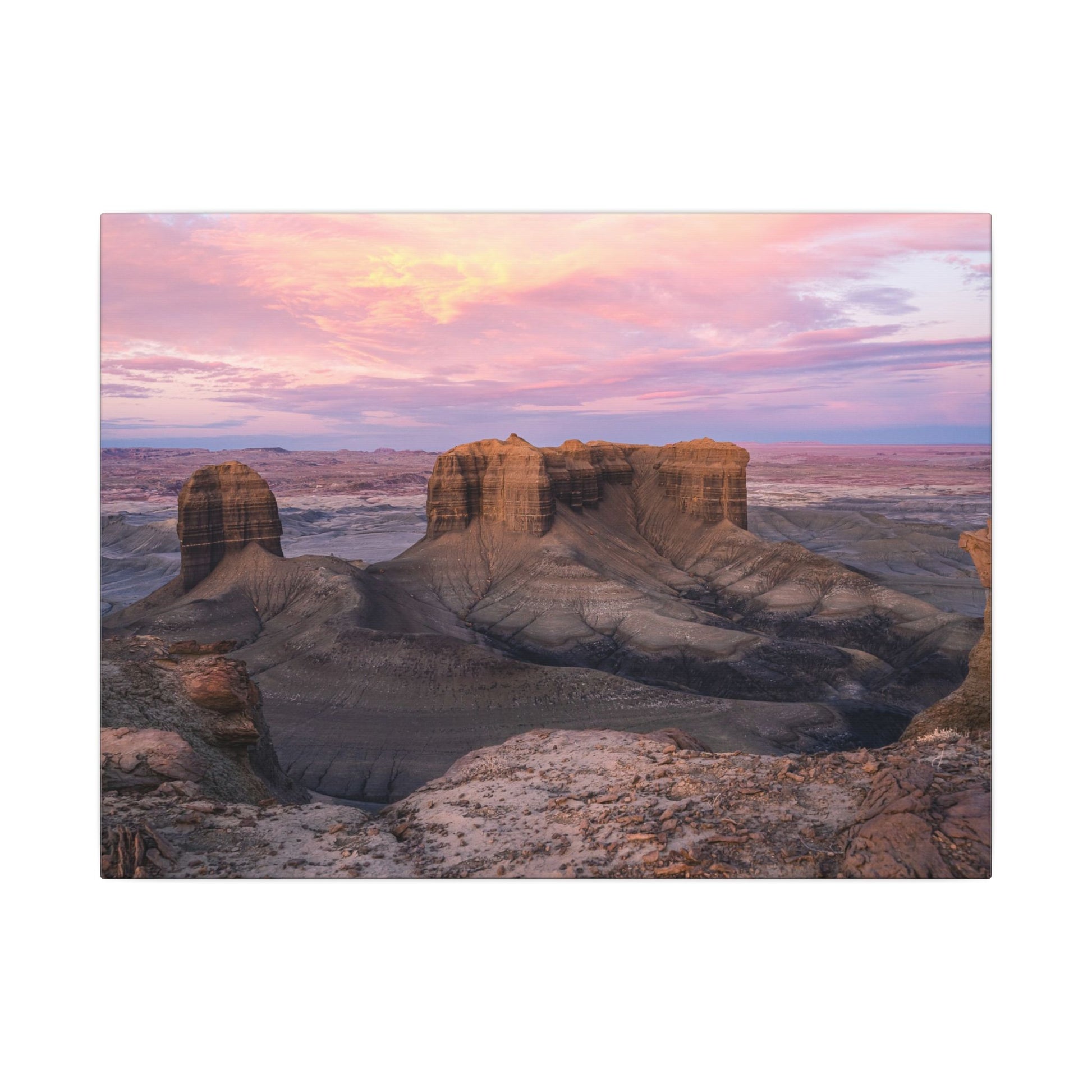 A stretched matte canvas print that captures a soft, Moonscape Overlook, Utah desert sunset in delicate pastel tones. Printed with UL-certified Greenguard Gold latex inks on a durable cotton-poly canvas, the image maintains vivid color and subtle detail without glare. The canvas is stretched over sustainably sourced radiata pine using a proprietary profile for a clean, gallery-ready 0.75" depth. Rubber corner dots on the back keep the piece steady on the wall, and the coated surface preserves the print for years. Slight size variances may occur from the hand-stretching process.