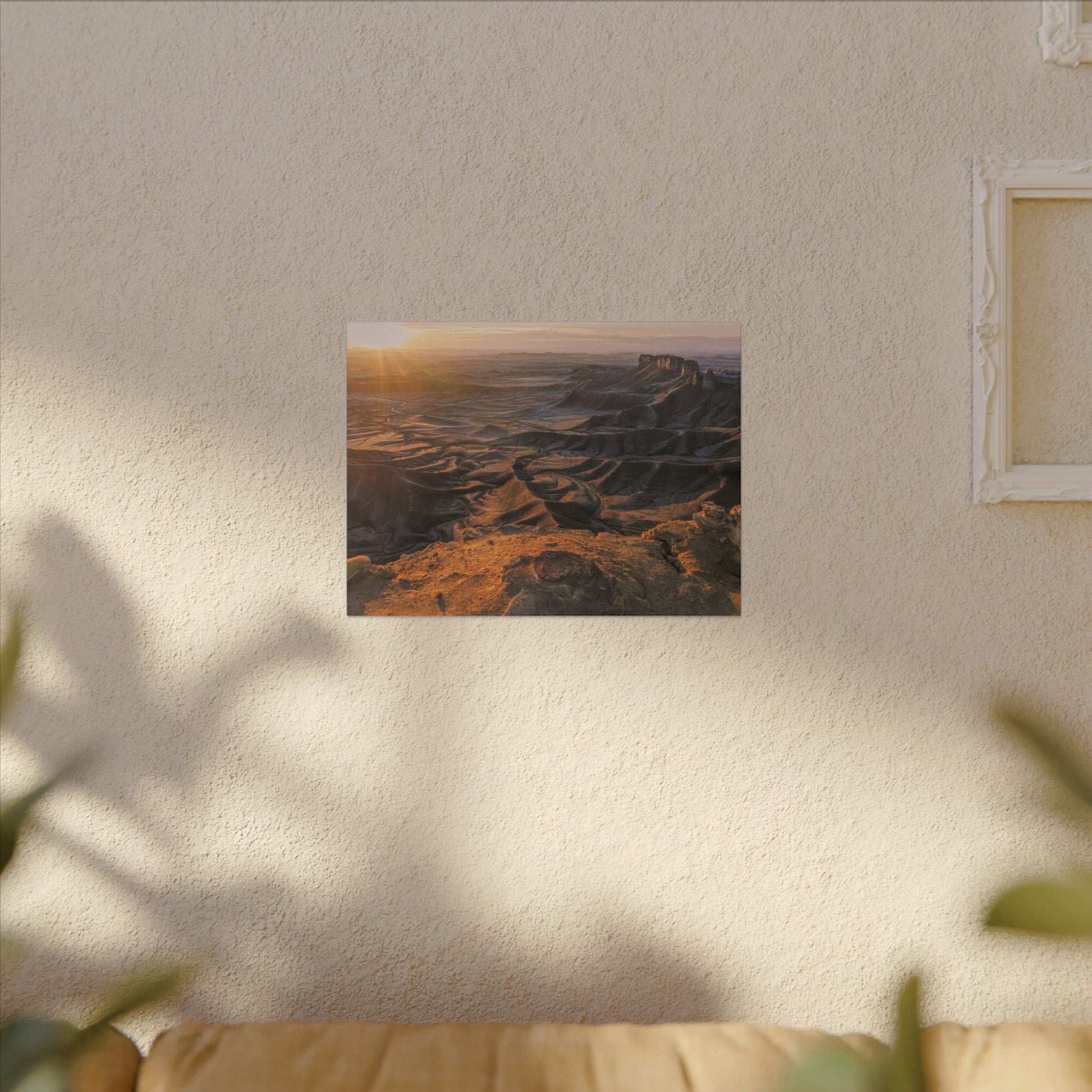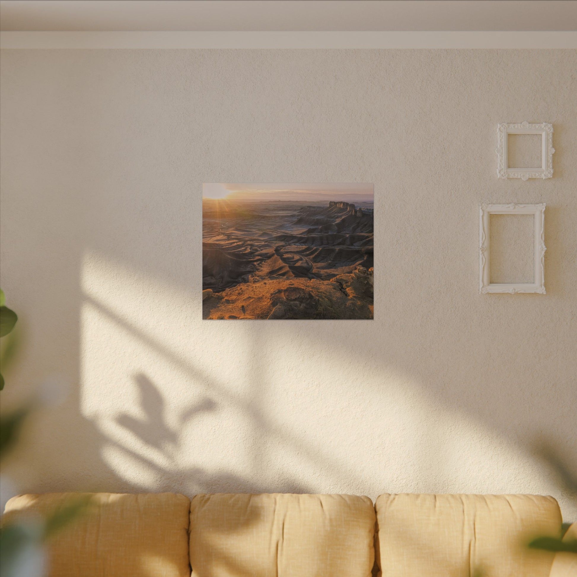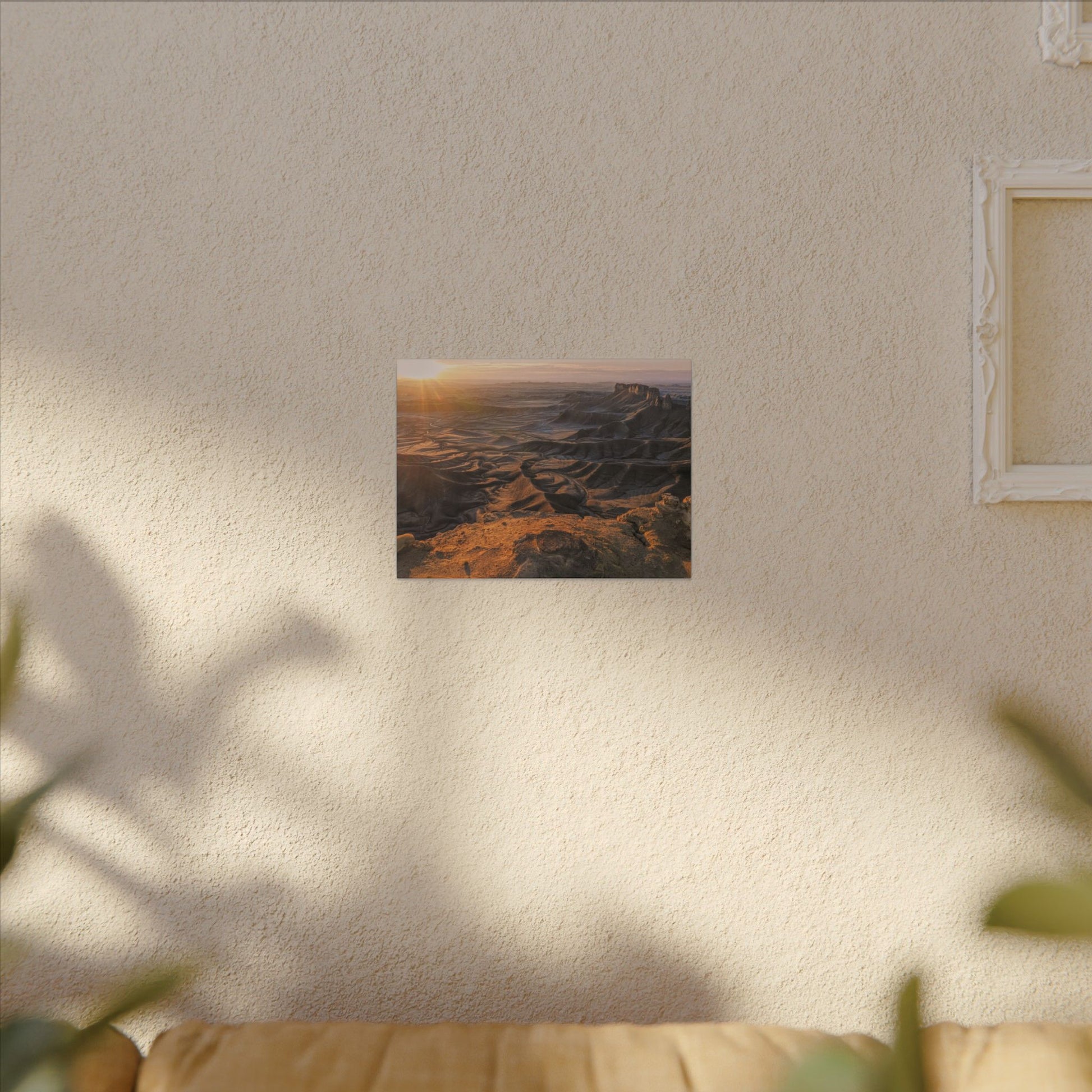 This stretched matte canvas brings the Moonscape Overlook, Utah, a sunrise-drenched canyon scene into your space with quiet strength. The low-reflective finish keeps colors true and the subtle texture of the canvas adds depth to each ridge and shadow. Mounted on a slim 0.75" pine frame, it sits close to the wall for a modern, gallery-style look. The result is an artful presence that settles into living rooms, home offices, or entryways and invites a slow, soothing pause every time you pass by.
